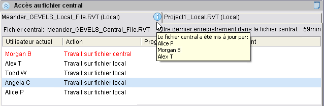 Lorsque vous travaillez sur une copie locale d'un fichier de projet, ouvrez l'onglet correspondant du volet Accès au fichier central pour déterminer si le fichier a été mis à jour par d'autres utilisateurs.