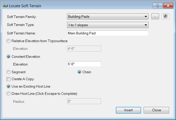 - Elevation (Elévation). Spécifiez si l'élément de site suit le terrain existant (Relative Elevation from Toposurface (Elévation relative à partir de la surface topographique) ou coupe la surface topographique pour conserver une élévation constante (Constant Elevation (Elévation constante). Entrez la distance au-dessus (valeur positive) ou au-dessous (valeur négative) de la surface topographique.