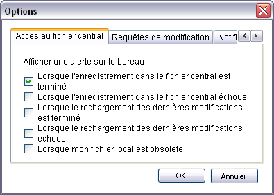 Activez une option pour indiquer que vous souhaitez recevoir des alertes sur votre bureau en cas de problèmes liés au fichier central. Désactivez une option pour ne pas recevoir un type d'alerte particulier.