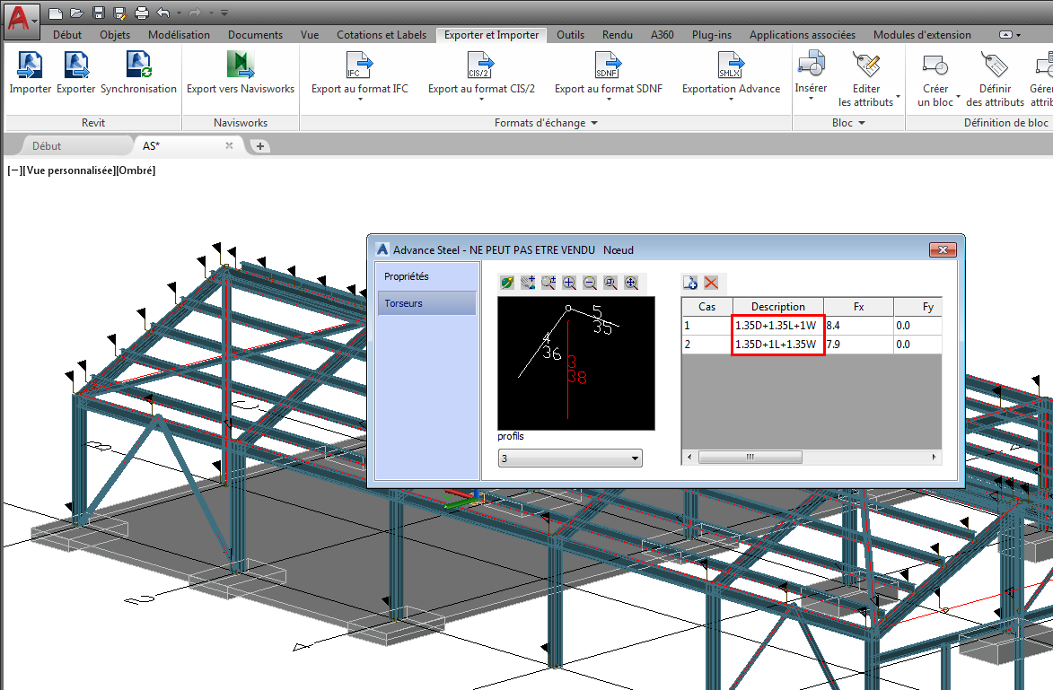 Seuls les résultats de l'analyse de Combinaisons de charges sont transférés du projet Revit vers les noeuds analytiques dans Advance Steel.
