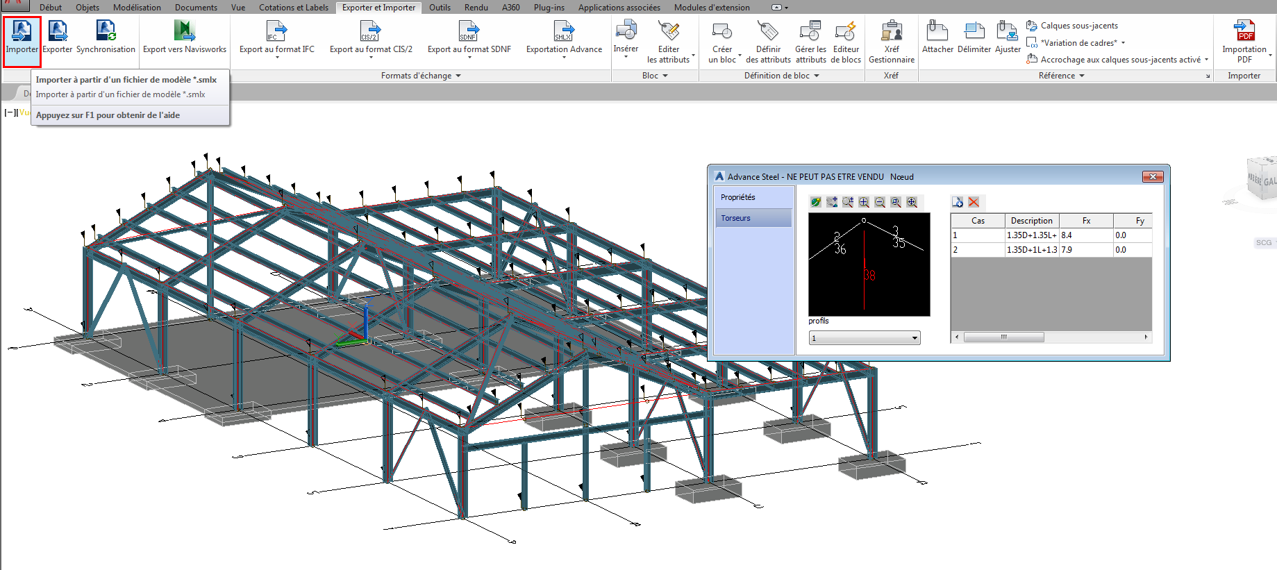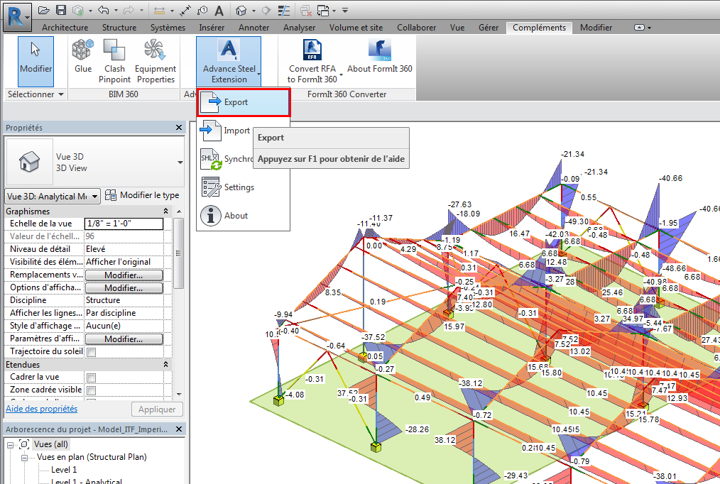 Utilisez Advance Steel Extension for Revit pour transférer les résultats de l'analyse d'un projet Revit vers un modèle Advance Steel.