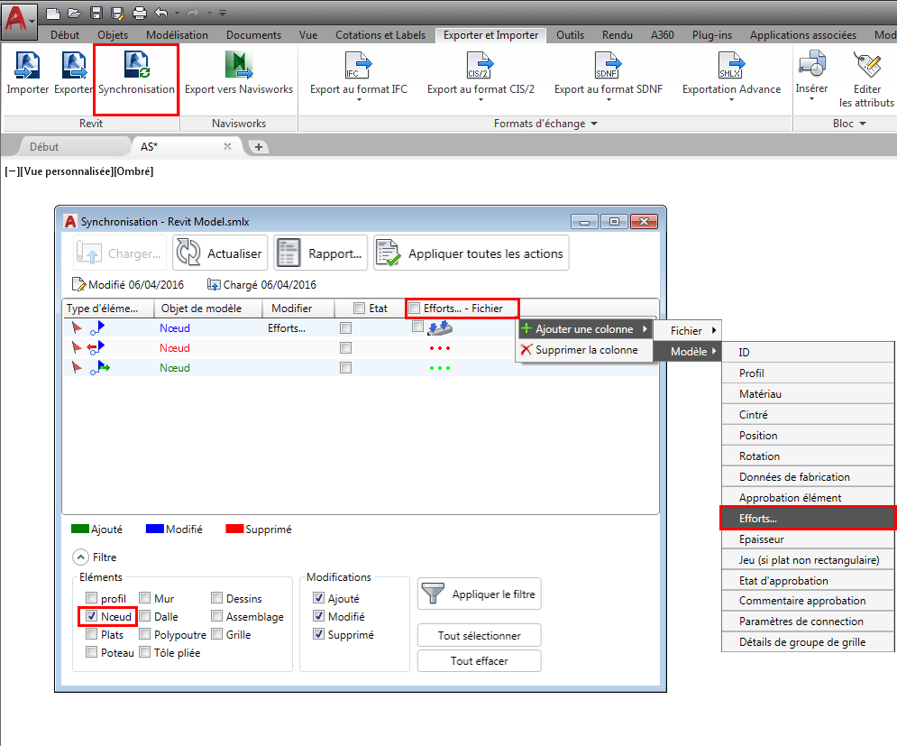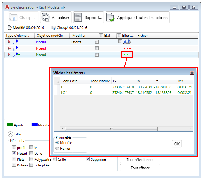 Les noeuds analytiques sont également disponibles dans la boîte de dialogue Synchronisation d'Advance Steel. La boîte de dialogue est en mesure de détecter la suppression d'un noeud, la création d'un nouveau nœud ou la modification des valeurs des résultats de l'analyse au sein de l'un des noeuds.