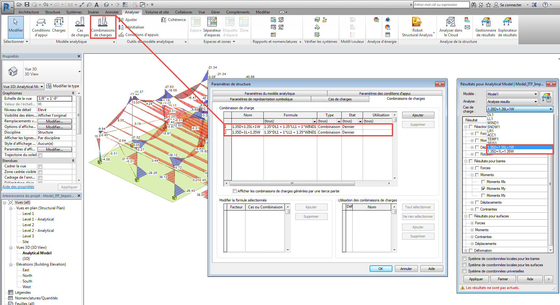 Dans l'image suivante, la fenêtre Combinaisons de charges dans Revit affiche seulement deux cas de combinaison de charge. Robot Structural Analysis repère les résultats de l'analyse pour ces deux combinaisons de charges et également de plusieurs cas de charge.