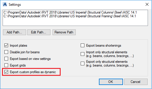 A partir de la version 2018, Advance Steel Extension for Revit permet d'exporter des profils personnalisés (non-standard) en tant que profils dynamiques. Le transfert des familles en acier de construction standard n'est pas affecté par cette fonction.