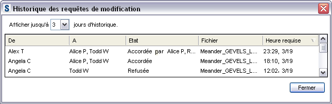 Dans Worksharing Monitor, le volet Historique des requêtes de modification répertorie les requêtes acceptées, refusées et retirées.