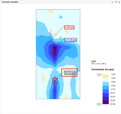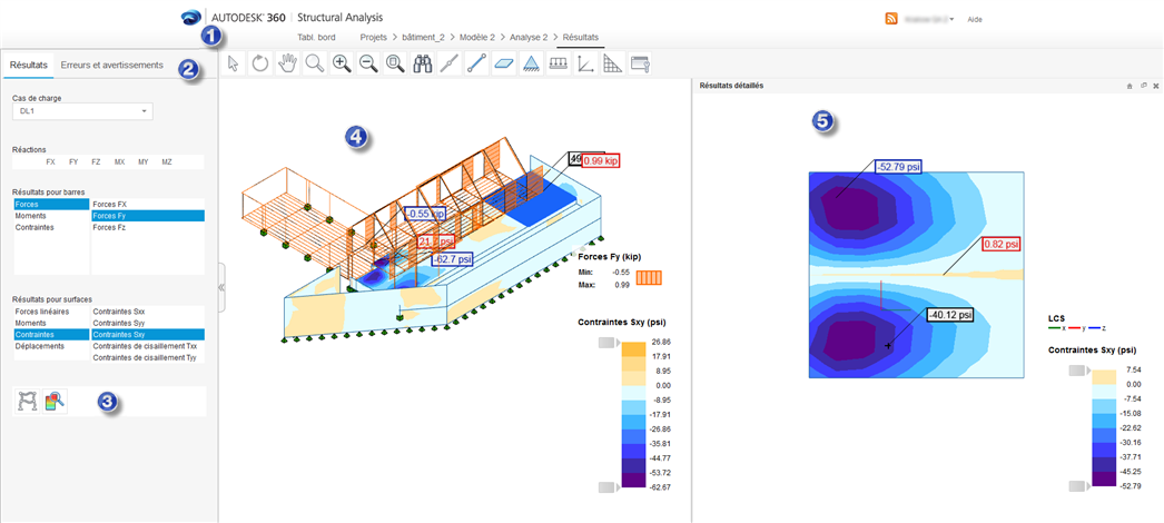 Explorer les résultats détaillés. Elle affiche les valeurs extrêmes du type de résultat sélectionné, des textures (pour les éléments de surface) et des diagrammes (pour les membres) d'un élément sélectionné dans la vue 3D (4). Vous pouvez également afficher les valeurs de résultats aux points que vous sélectionnez.
