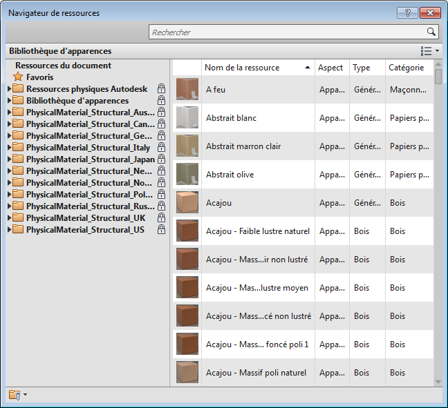 Les ressources sont enregistrées dans un projet Revit ou dans une bibliothèque. Les ressources qui se trouvent dans un projet Revit mais qui ne sont référencées par aucun matériau sont enregistrées dans la bibliothèque des ressources non référencées. Vous pouvez créer et modifier des ressources non référencées lors d'une session Revit en fonction de vos besoins. Toutefois, vous devez enregistrer votre projet Revit pour enregistrer les ressources non référencées créées ou modifiées durant la session.