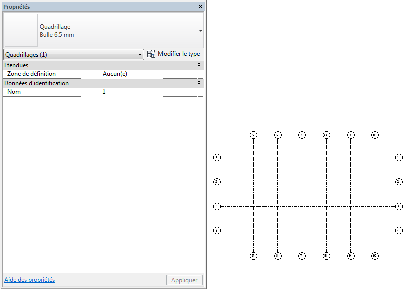 La grille AutoCAD Architecture est créée dans le plan du niveau inférieur du modèle Revit qui ne descend pas plus bas que le contour du modèle de la vue. Les blocs à vues multiples pour les bulles de quadrillage sont ancrés sur les extrémités des lignes de quadrillage et seront créés sur le même plan.