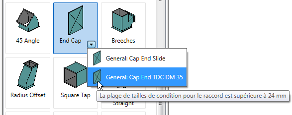 Cela indique que l'élément de fabrication n'est actuellement pas pris en charge avec le contenu d'élément (ITM) dans Revit. Actuellement, les composants de fabrication de gaine flexible, d'éléments de structure, de bouches d'aération et d'équipement mécanique ne sont pas pris en charge. A la place de ces composants, vous pouvez utiliser des composants basés sur la famille Revit (RFA) à l'aide des outils de positionnement standard de la catégorie.