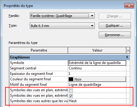- Pour afficher les bulles de quadrillage au point de départ des lignes de quadrillage dans une vue en plan, sélectionnez Symboles des vues en plan, extrémité 1 (par défaut).
