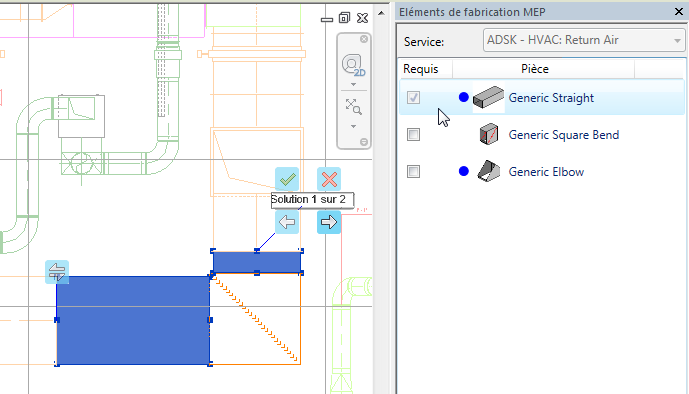 Le point de départ doit être un connecteur d'un élément de fabrication. Cependant, le point d'arrivée peut être sur un élément Revit générique, tel qu'une gaine, une canalisation ou un équipement mécanique.