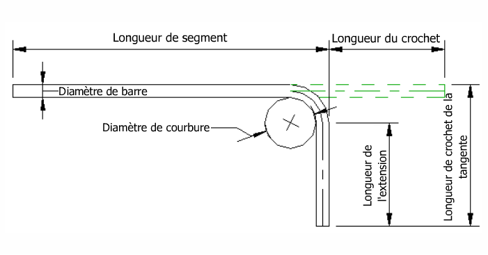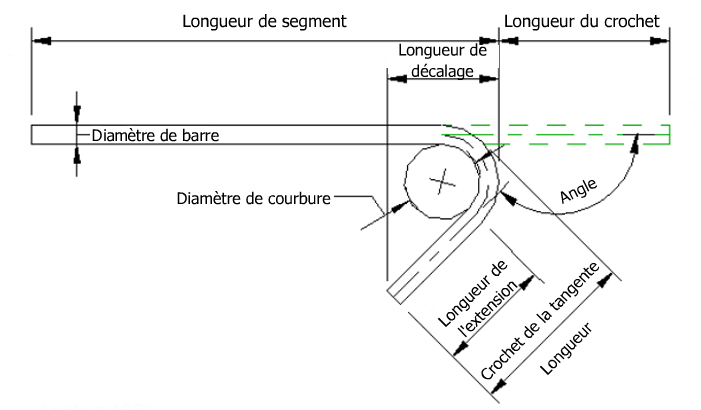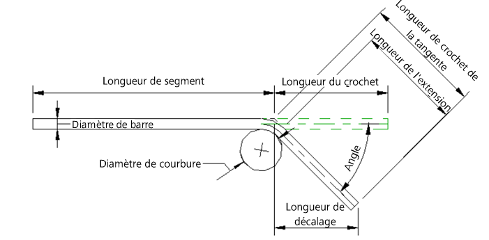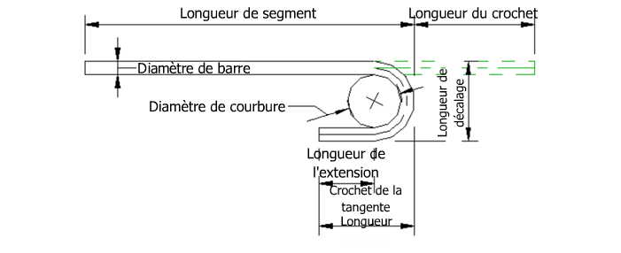 Les images suivantes décrivent les paramètres qui définissent un crochet d'armature.