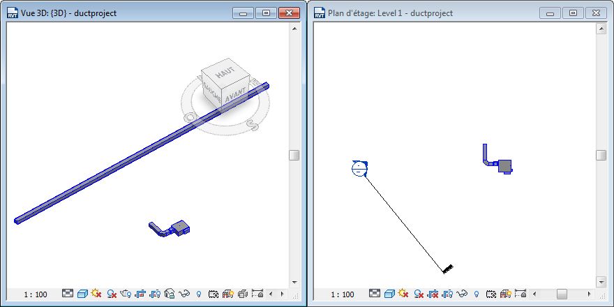 Si aucun connecteur n'est disponible dans la plage de la vue, la gaine est connectée à l'aide d'un té, à l'intersection du plan de la vue et du segment. L'axe de la gaine est placé exactement sur le plan de la vue.