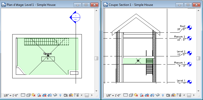 - Fermez toutes les vues, à l'exception de la vue en coupe et de la vue de plan d'étage du niveau de plénum, puis tapez WT pour disposer les deux vues en mosaïque.