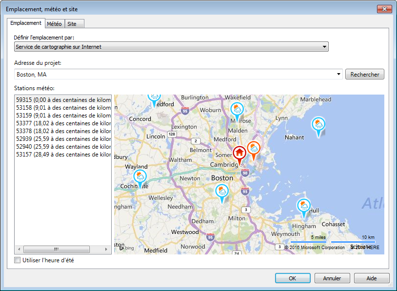 Avant de procéder à l'optimisation d'énergie du modèle de bâtiment, spécifiez son emplacement géographique et sélectionnez une station météo proche.