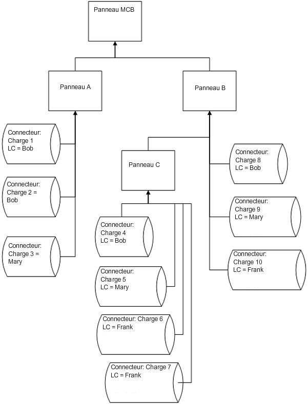 Demande de charge totale (Panneau MCB) = DFBob * (1+2+4+8) + DFMary * (3+5+9) + DFFrank * (6+7+10)