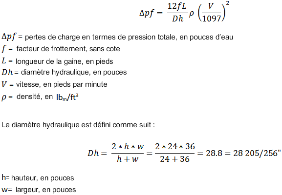L'exemple suivant montre comment Revit calcule la chute de pression pour un segment de gaine rectangulaire 36" x 24" de 100 pieds transportant un écoulement d'air de 12 000 CFM.
