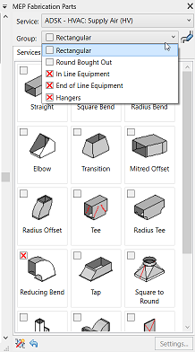 Dans la palette Eléments de fabrication MEP, sélectionnez les éléments qui ne seront pas utilisés avec les outils de remplissage automatique (Auto).