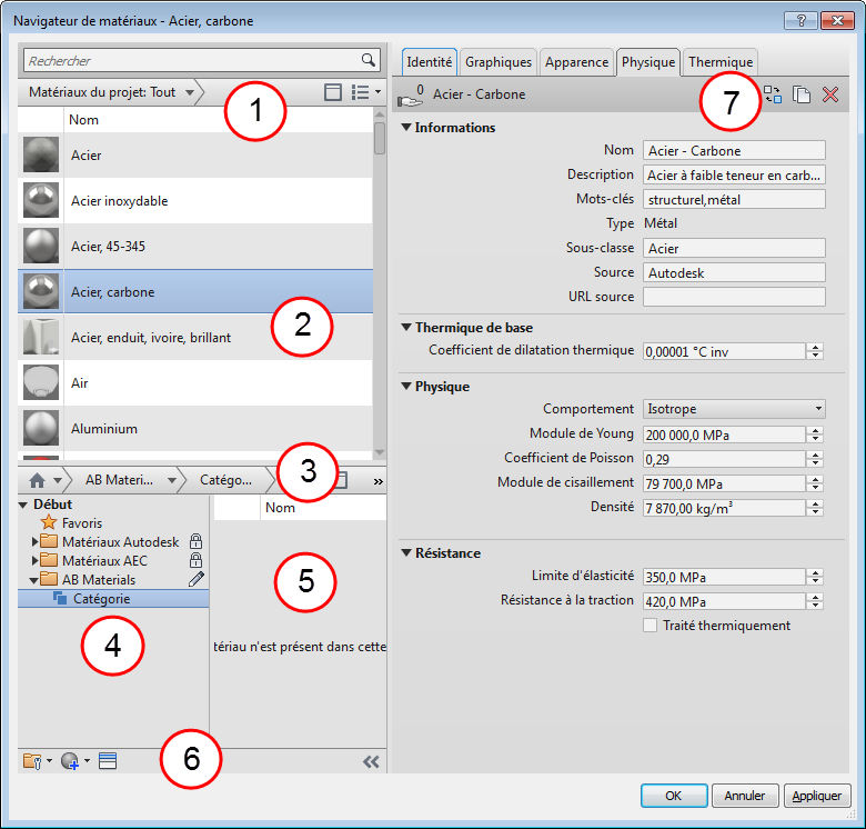 5 | Liste des matériaux de la bibliothèque : affiche les matériaux de la bibliothèque ou de la catégorie (classe) sélectionnée dans la liste de bibliothèques. |