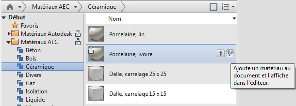 . Ce bouton ajoute un matériau de la bibliothèque à la liste des matériaux du projet.