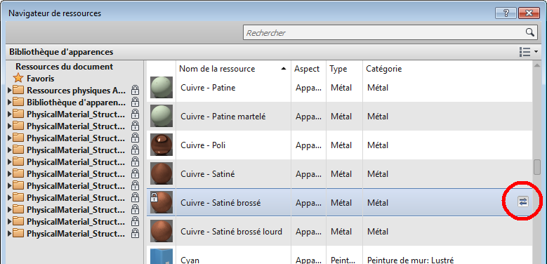 - Dans le panneau Editeur de matériaux de la boîte de dialogue Navigateur de matériaux, cliquez sur l'onglet de la ressource à remplacer (Apparence, Physique, Thermique, etc.), puis cliquez sur le bouton de remplacement de ressource