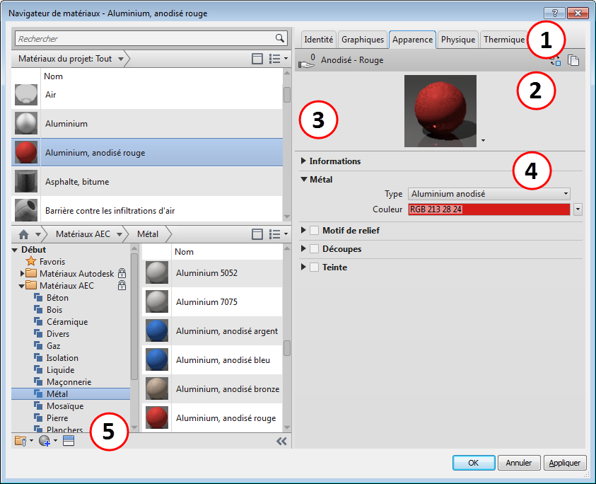 4 | Groupe de fonctions Propriétés : permet d'afficher et de gérer des propriétés détaillées de la ressource détaillée. Le nom et la description de la ressource sont affichés dans le groupe de fonctions déroulant Informations. L'exemple ci-dessus illustre les propriétés Métal affichées (développées) pour la ressource Apparence Anodisé - Rouge. |