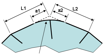 smooth transition (b) By activating the Smooth by option, the sharp corner is eliminated. Thus, the direction of the reaction force changes smoothly as the node (removed for clarity) moves from left to right. The distances a1 and a2 are calculated as follows: a1=smoothing factor * L1 a2=smoothing factor * L2 |