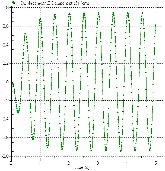 13. Select the node at the lumped mass (Selection Shape Point or Rectangle and Selection Select Nodes and click the node at the top of the model). Right-click and select Graph Value(s). This creates a second presentation window with a graph. The results should look like Figure 2. Quasi-steady state conditions are reached after approximately five cycles. Visually, the results appear to be about 0.75 cm, the expected displacement of the mass relative to the support.
