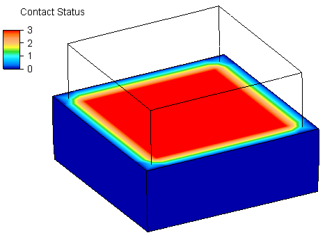 The vertical size of the legend and the number of tick marks adjusts automatically to show only the range of status integers present in the analysis results. Color blending might give a false impression of a contact status that is not actually present in the results. For example, the following image is of a model that only has status=0 (open) and status=3 (stick) results. However, the color blending across a single element width produces a band of orange, yellow, green, and cyan (color transition); though the nodal contact status result is never 1 or 2: