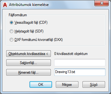 Az AutoCAD Drawing Interchange File (rajzcserefájl) formátum egy olyan változatát hozza létre, amely csak blokkreferenciát, attribútumot és sorozatvége objektumot tartalmaz. DXF ™ formátumú kiemeléshez nincs szükség sablonra. A kimeneti fájlt a normál DXF-fájloktól a .dxx fájlkiterjesztés különbözteti meg.