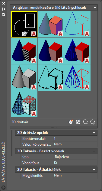 A Látványstílus-kezelő a rajzban rendelkezésre álló látványstílusok mintaképeit tartalmazó panellal és az alábbi tulajdonságok panelekkel rendelkezik: