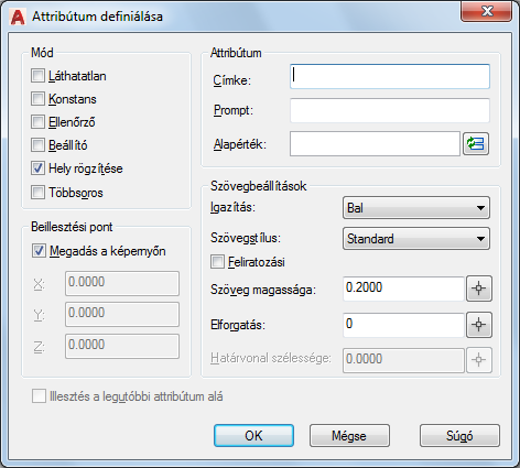 Az attribútum helyét határozza meg. Adjon meg koordináta-értékeket, vagy válassza a Megadás a képernyőn lehetőséget, és a mutatóeszközzel határozza meg az attribútum más objektumokhoz viszonyított elhelyezkedését.