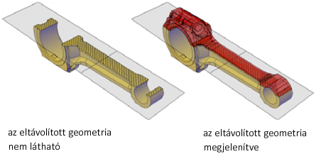 A lemetszett geometria bekapcsolásával megjelenítheti a teljes objektumot a metszősíkkal együtt. Ez a (helyi menüben elérhető) funkció csak olyankor kapcsolható be, ha a metszősík aktív.