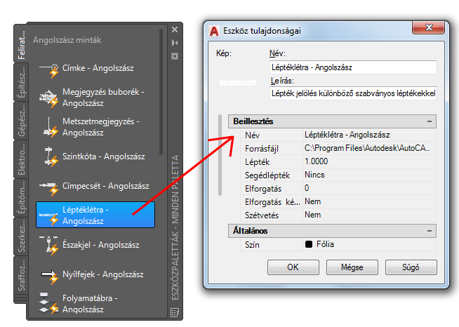 Az eszközpalettán található eszközök tulajdonságai megváltoztathatók. Módosíthatja például egy blokk beillesztési léptékét vagy egy sraffozási mintázat szögét.