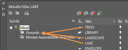 Ebben a példában a Grounds nevű fóliacsoport-szűrőt hozom létre, és a TREES, LANDSCAPE és LAKE fóliákat húzom a csoportszűrőre.
