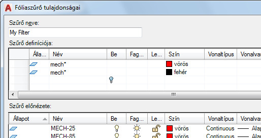 Ebben a példában a fóliatulajdonság-szűrő olyan fóliákat tartalmaz, amelyek a „mech” kifejezéssel kezdődnek és vörösek, vagy olyan fóliákat, amelyek a „mech” kifejezéssel kezdődnek, ki vannak kapcsolva és fehérek.