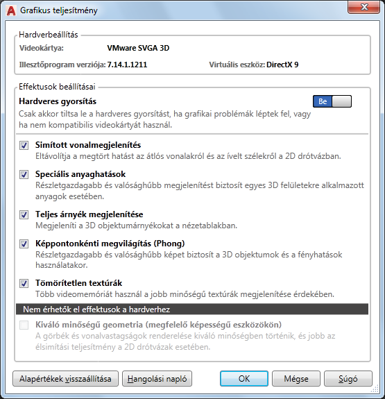 Engedélyezi a hardveres gyorsítás alkalmazását, és hozzáférést biztosít az aktuális meghajtón elérhető összes effektusbeállításhoz. Kikapcsolt állapotban csak a Simított vonalmegjelenítés beállítás van engedélyezve.