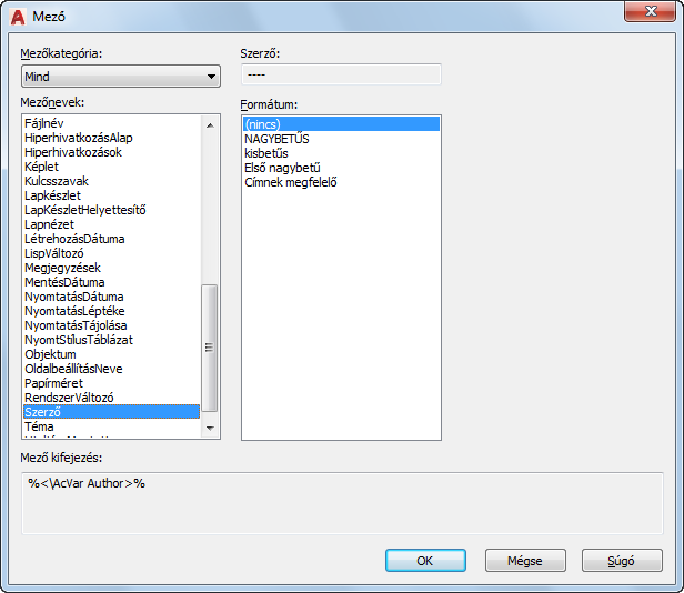 Az ehhez az elemhez tartozó címke változik a mezőnévvel. Ha például a Fájlnév kerül kijelölésre a Mezőnevek listában, akkor a címke a Fájlnév lesz, az érték pedig az aktuális rajzfájl neve. A többi mezőhöz a címke a Tulajdonság. Kivétel: dátum mező kiválasztásakor a kiválasztott dátum formátum jelenik meg, például: H/n/éééé.