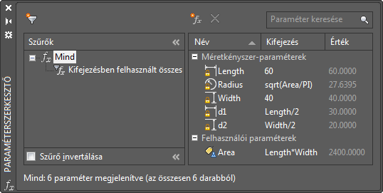 Amint az látható, a kör területét megadó egyenlet egy része szerepel a Sugár méretkényszer-paraméterben, részben pedig felhasználói paraméterként van definiálva. Másik megoldásként a teljes [sqrt (hossz * szélesség / PI)] kifejezést a sugár méretkényszer-paraméterhez lehet társítani egy felhasználói változóban megadva, de egyéb kombináció is jó lehet.