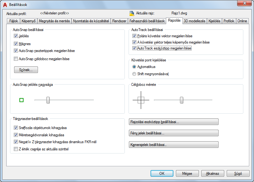 Szabályozza a beállításokat, amelyek az AutoTrack ™ viselkedéséhez kapcsolódnak, amely akkor áll rendelkezésre, amikor a poláris követés vagy tárgyraszter követés be van kapcsolva (lásd: RAJZBEÁLL parancs).