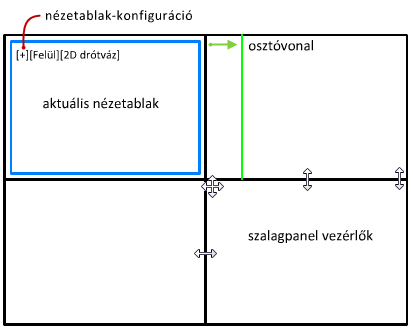 - A zöld osztóvonal megjelenítéséhez és új nézetablakok létrehozásához nyomja le a CTRL billentyűt a nézetablak határvonalainak húzása közben. Azt is megteheti, hogy a legkülső szalagpanel vezérlőket húzza.