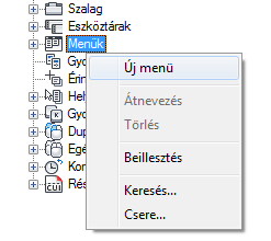 A Testreszabás lap <fájlnév> testreszabási beállításai ablaktábláján kattintson a jobb gombbal a Menük csomópontra. Kattintson az Új menü menüpontra.