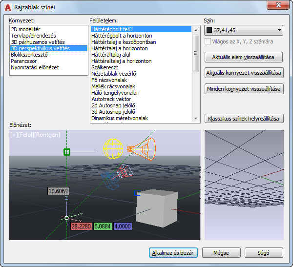Megadja, hogy az X, Y és Z tengelyen színvilágosítás alkalmazva lesz-e az alábbi interfész elemekre: szálkereszt mutató, Autotrack vektorok, alapsík rácsvonalak és skiccelési eszköztárak.