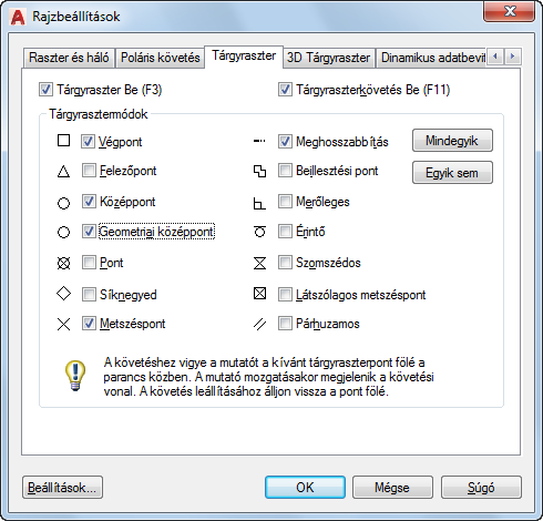 A futó traszternek is nevezett futó tárgyraszter beállításokkal egy pontot adhat meg az objektum egy bizonyos helyén. Nyomja le a TAB billentyűt a beállítások közötti lépkedéshez.