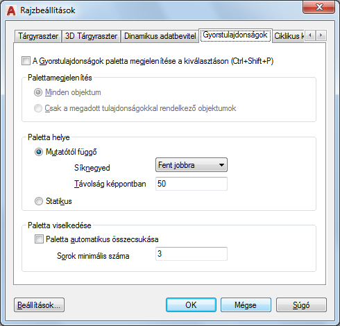 A Gyorstulajdonságok palettát jeleníti meg az objektumok kiválasztásakor, az objektumtípustól függően. (QPMODE rendszerváltozó)