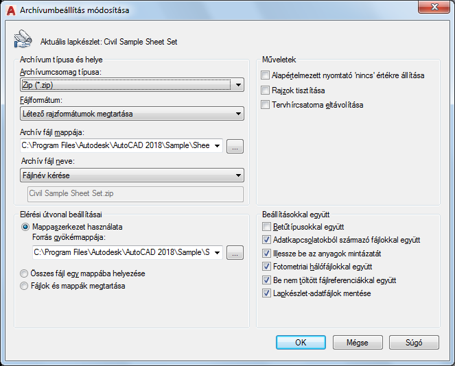 Az archív csomagba menti a lapkészlet-adatfájlt (DST), a címkeblokk rajzfájlokat, a megjegyzésblokk rajzfájlokat és a rajzsablon (DWT) -fájlokat.
