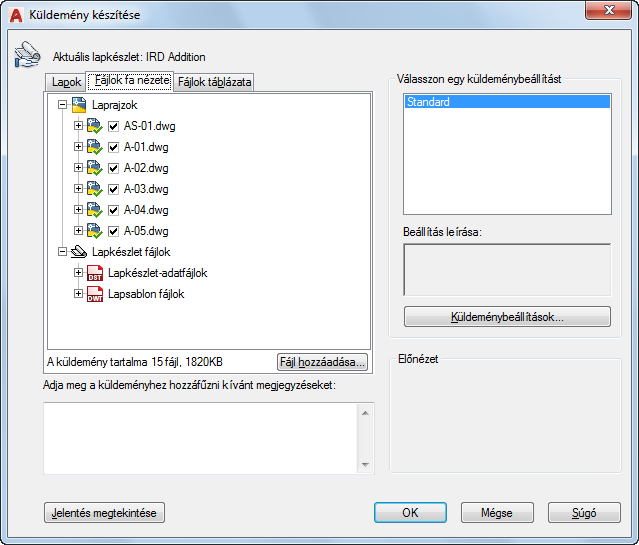 Jelentésinformációt jelenít meg, amely belekerül a küldeménycsomagba. Magában foglal minden beírt küldemény-megjegyzést, és tartalmazza azokat a program által automatikusan létrehozott disztribúciós megjegyzéseket, amelyek részletezik, hogy milyen lépések szükségesek a küldeménycsomag tökéletes működéséhez. Ha például SHX betűtípusok találhatók egy küldött rajzban, megjelenik egy útmutató arról, hova kell másolnia ezeket a fájlokat ahhoz, hogy azok a küldeményt telepítő számítógépen észlelhetők legyenek. Ha készült alapértelmezett megjegyzéseket tartalmazó szövegfájl, akkor a jelentés ezeket is tartalmazza.