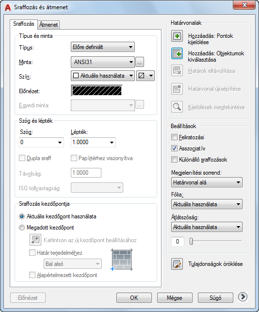 A Sraffozás és átmenet párbeszédpanelen két lapot és néhány közös beállítást tartalmaz, amelyek mindkét lapról elérhetőek.