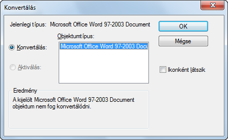 Az Objektumtípus területen megadott típusként nyitja meg a beágyazott objektumot, de a módosítás után visszatér az aktuális típushoz.