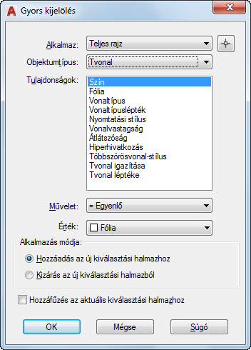 Ha a Hozzáfűzés az aktuális kiválasztási halmazhoz opció kiválasztásra került, azzal a teljes rajzra alkalmazza a szűrési feltételt.